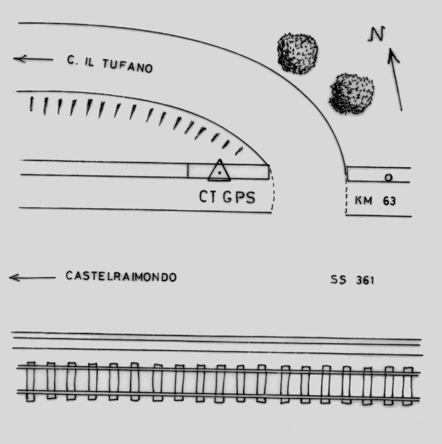 | materializzazione | Centrino in acciaio inox del tipo "GPS da livellazione" infisso alla sommità della parte più bassa del muro di controripa esistente sul lato nord della S.S. 631 al km 63,100. |