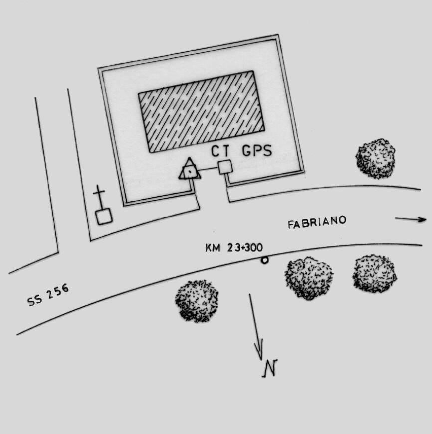 | materializzazione | Centrino in acciaio inox del tipo "GPS da livellazione" infisso in corrispondenza del centro geometrico della sommità del pilastro di sinistra entrando del cancello di accesso al resede antistante l'edificio ubicato al km 23,300 della S.S.256. |
