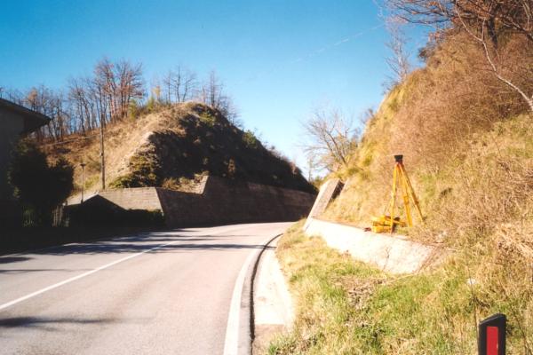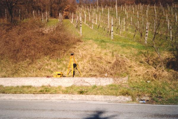 Centrino in acciaio inox del tipo "GPS da livellazione" infisso alla sommità della parte ad est più bassa del muro di contenimento in cemento armato, esistente in corrispondenza dell'imbocco della strada di accesso all'impianto E.N.E.L. della diga di Polverina.