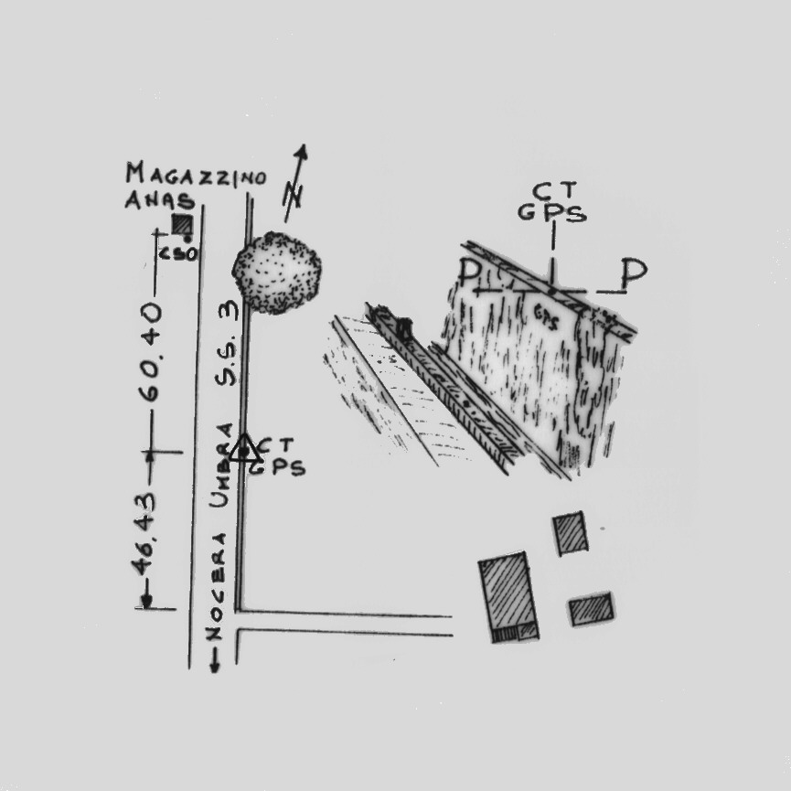 | materializzazione | Centrino del tipo "GPS C" fissato alla sommità del muro di sostegno in cemento armato, lato carreggiata direzione Gualdo Tadino, della S.S.3, all'altezza del km 183+120 ed a circa 60 metri da un magazzino ANAS sito sul lato opposto della strada. |
