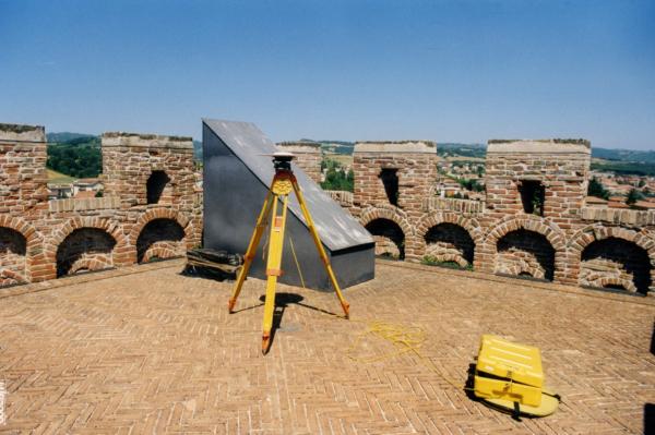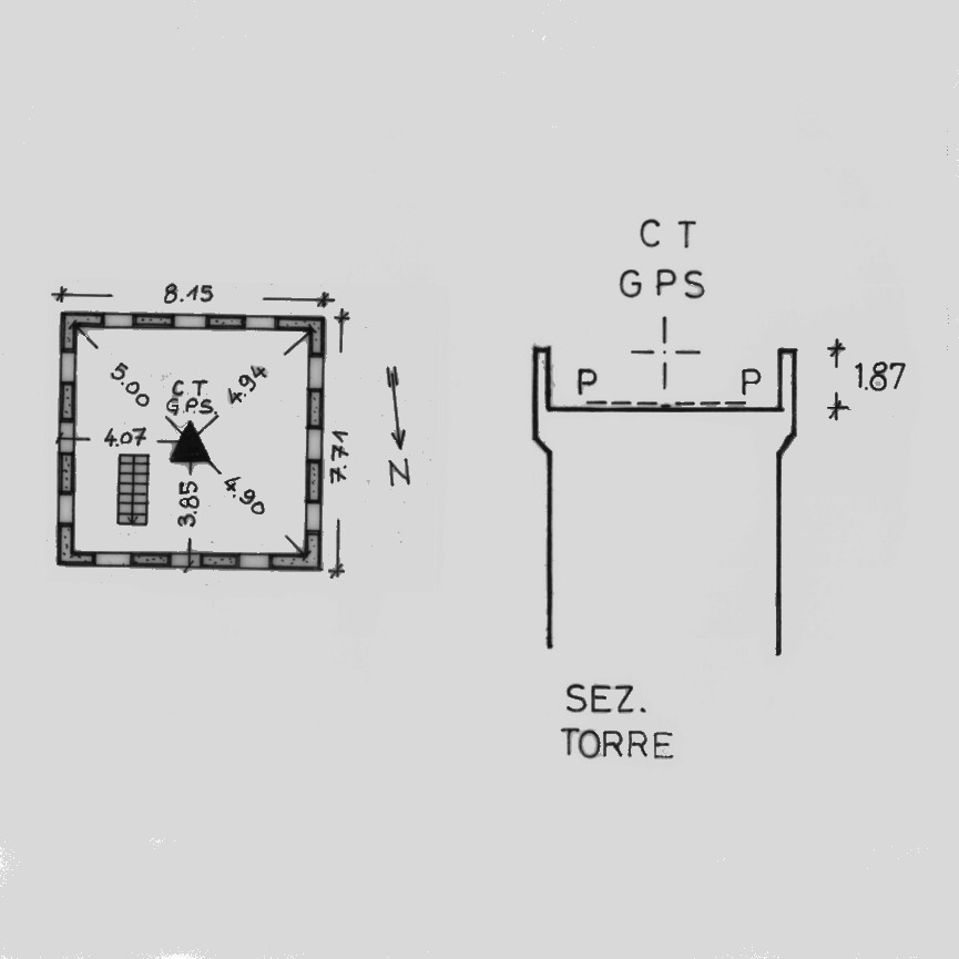 Centrino in acciaio inox del tipo "GPS A" fissato nel centro della pavimentazione della terrazza, alla sommità della ex torre carceraria, in corrispondenza dell'asse geometrico della stessa.
