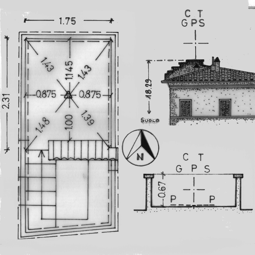 | materializzazione | Centrino del tipo "GPS C" fissato nel centro della terrazzina di copertura, corrispondente all'asse geometrico della stessa. |