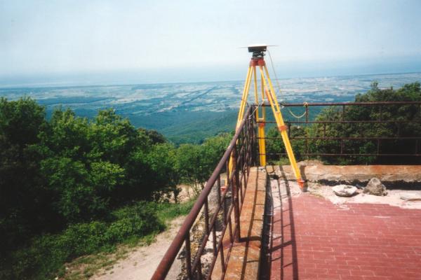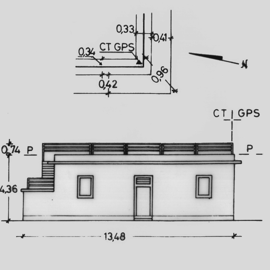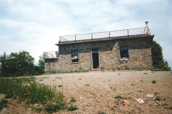 Centrino del tipo "GPS A" fissato su preesistente centrino IGM cementato in prossimità dello spigolo sud-ovest (all'incrocio dei cordoli perimetrali) della terrazza sovrastante un ex ristorante, alla sommità del poggio omonimo.