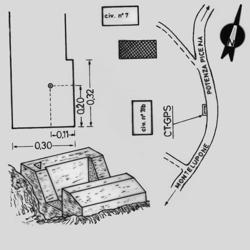 | Materializzazione | Centrino del tipo "GPS C" fissato alla sommità del lato sud di un tombino per la raccolta dell'acqua piovana, ubicato sulla strada provinciale che da Montelupone conduce a Potenza Picena, contrada Spirito Santo, nel mezzo delle abitazioni contrassegnate con i numeri civici 7 e 7/b. |