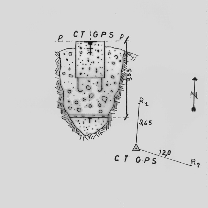 | Materializzazione | Centrino del tipo "GPS A" fissato su preesistente centrino IGM cementato in blocchetto di calcestruzzo prefabbricato, con sottostante centrino di fondo coassiale, posto alla sommità del monte omonimo, in prossimità della recinzione del bosco demaniale. |