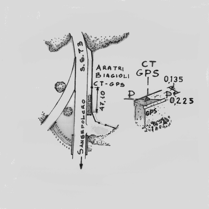 | Materializzazione | Centrino del tipo "GPS C" fissato alla sommità del muretto di base in cemento della recinzione delle officine "Aratri Biagioli", in corrispondenza della scritta GPS scolpita sulla parete dello stesso nei pressi del Ponte sul Rio Secco. |