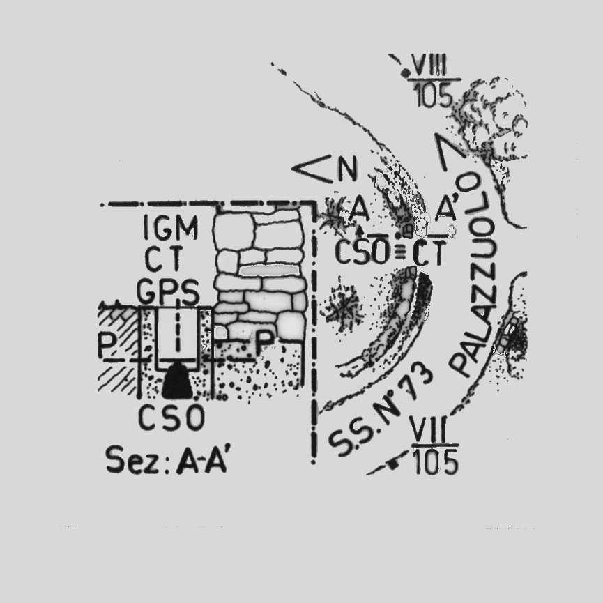 Punto di tangenza del piano orizzontale alla sommità della sporgenza semisferica in porcellana del caposaldo 27/107 (Q 1991)