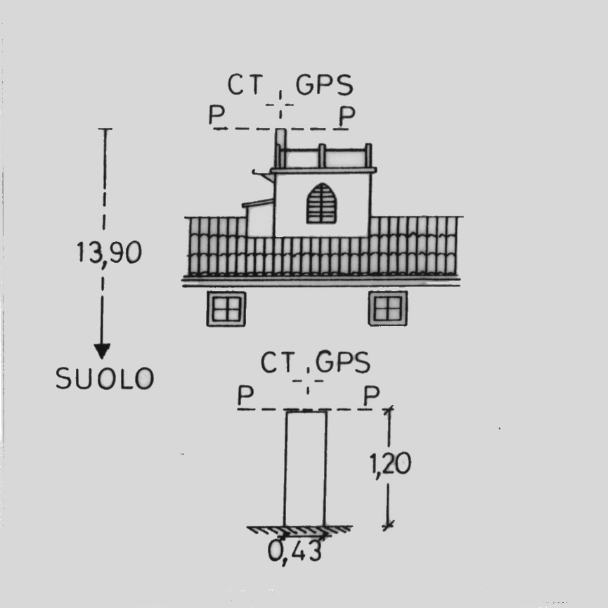 | Materializzazione | Centrino del tipo "GPS A" posto su preesistente centrino IGM, coincidente con l'asse geometrico di un pilastrino in cemento, eretto sul lato sud-ovest della terrazza di copertura della torretta sovrastante la villa di Lucardo (Via Lucardo Alto, 30). |