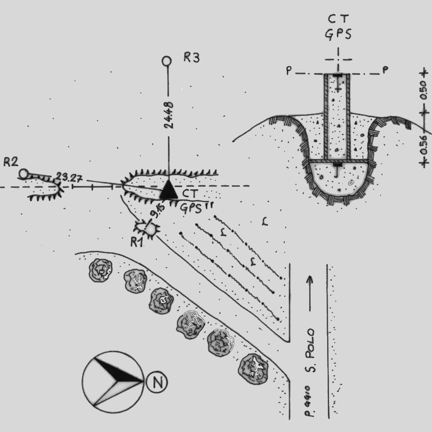 | Materializzazione | Centrino del tipo "GPS A" fissato su centrino IGM alla sommità di pilastrino in cemento, con sottostante centrino di fondo coassiale, sito alla sommità del poggio omonimo. |