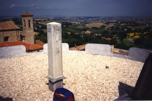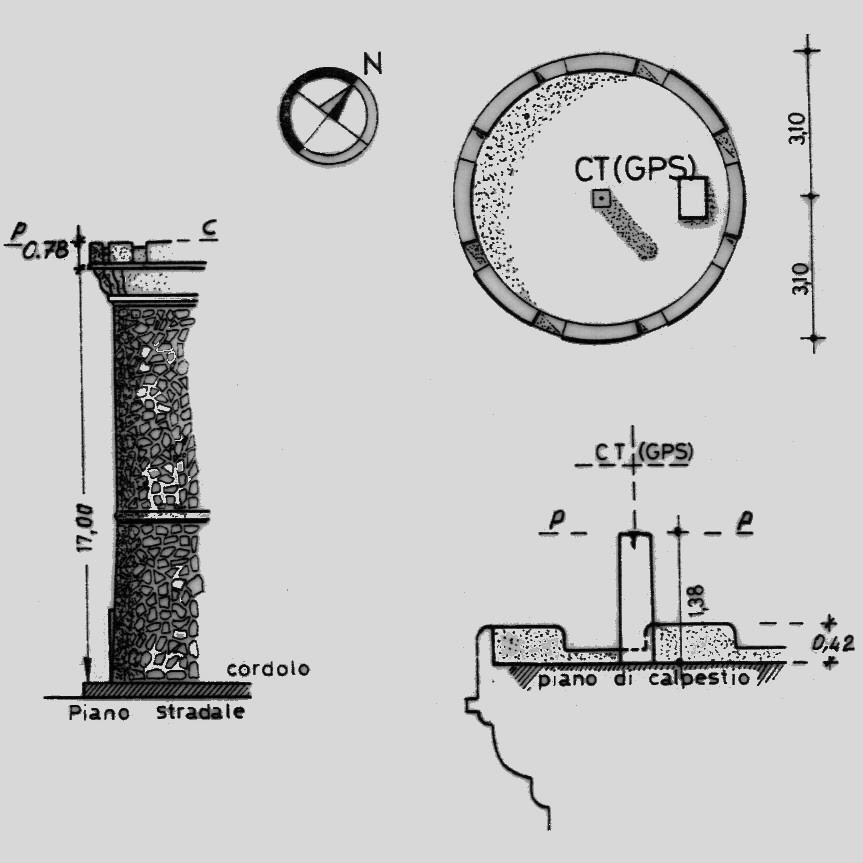 | Materializzazione | Centrino del tipo "GPS A" fissato coassialmente mediante collante, al centrino IGM in vetro preesistente. Il tutto posto alla sommità di un pilastrino in muratura eretto in corrispondenza del centro geometrico della torre adibita a serbatoio pensile dell'acquedotto. |