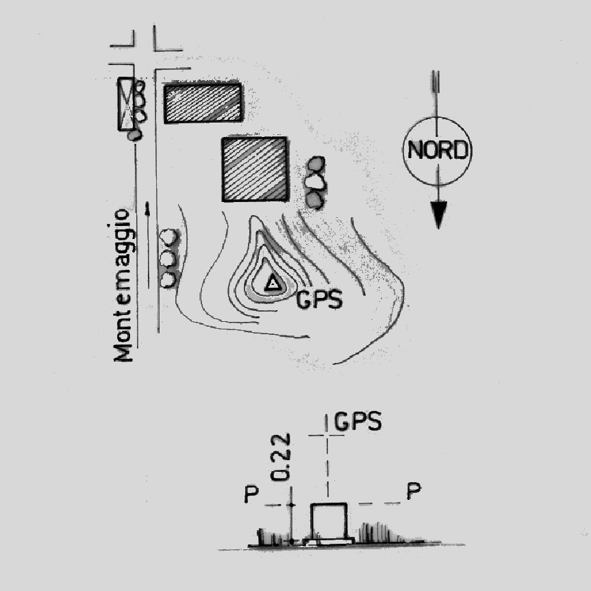 | Materializzazione | Centrino del tipo "GPS A" fissato su preesistente centrino IGM cementato in blocchetto in calcestruzzo prefabbricato con sottostante picchetto in ferro coassiale. |
