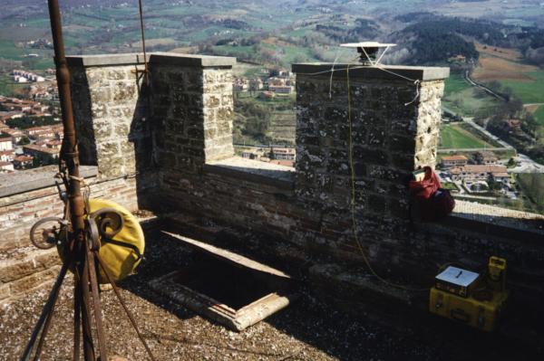 Centrino del tipo "GPS C" fissato alla sommità e in corrispondenza dell' asse geometrico del merlo centrale, lato nord – ovest della torre.