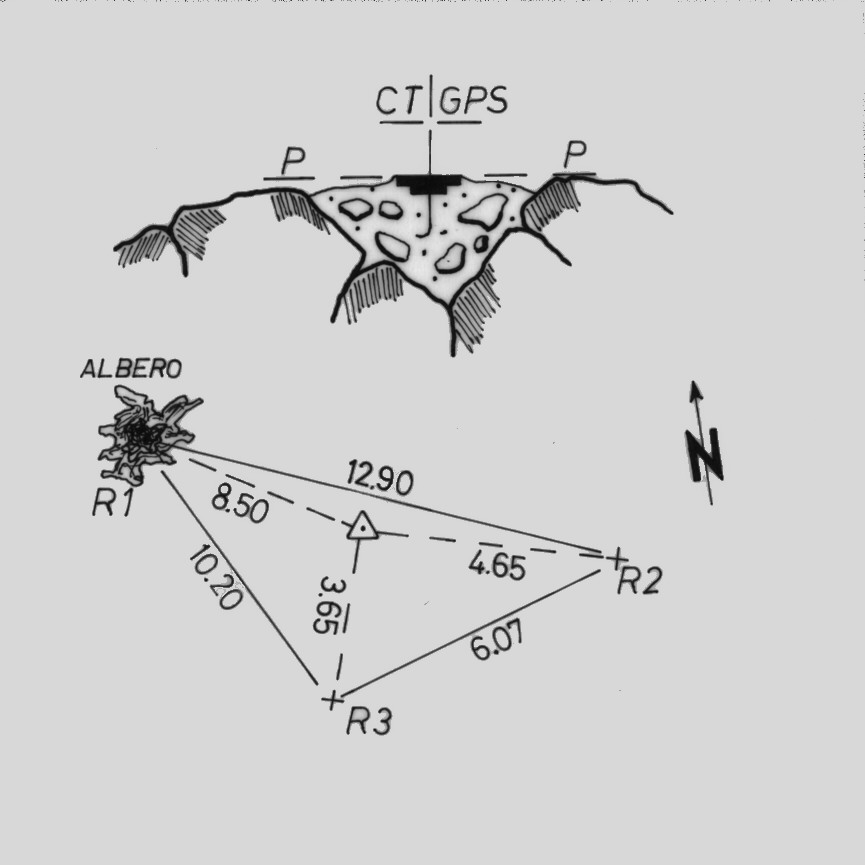 | Materializzazione | Centrino del tipo "GPS A" fissato su preesistente centrino IGM cementato in blocco di calcestruzzo su roccia affiorante posta alla sommità del monte omonimo. Riferimenti: R1 albero (300°) 8,50 m.; R2 (105°) 4,65 m.; R3 (197°) 3,65 m. croci incise su roccia. |