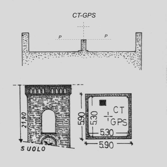 | Materializzazione | Centrino IGM del tipo di superficie cementato alla sommità del pilastrino posto sulla terrazza di copertura del campanile e coincidente con l'asse geometrico stesso. |