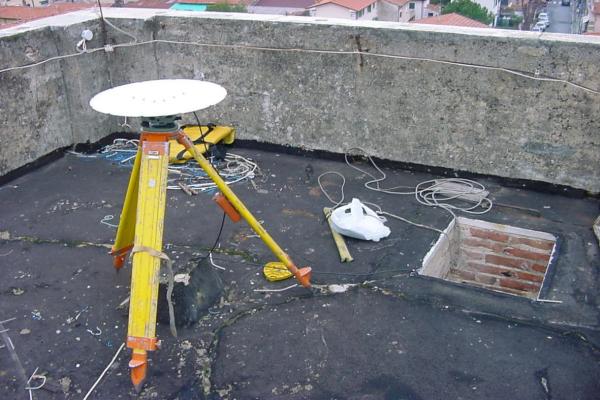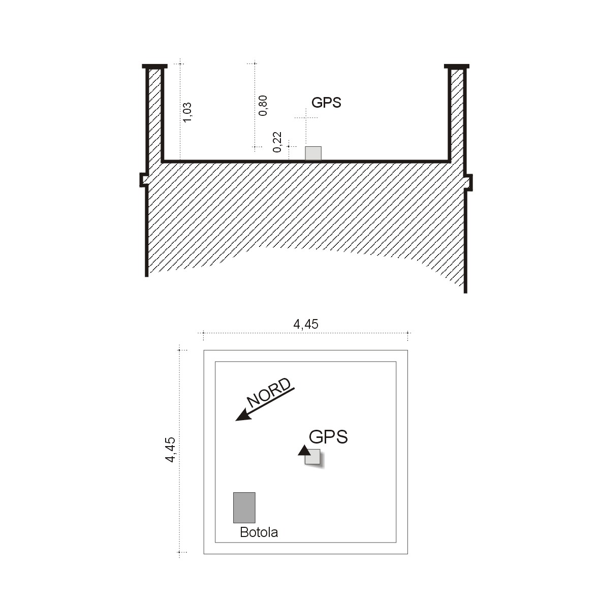 | Materializzazione | Centrino in acciaio inox del tipo "GPS C" fissato in corrispondenza dello spigolo ovest del pilastrino (ex base parafulmine) eretto pressochè nel centro della terrazza sovrastante la cella campanaria. Il centrino è posizionato in corrispondenza del centro geometrico della terrazza e coincide con l'asse geometrico del campanile stesso. |