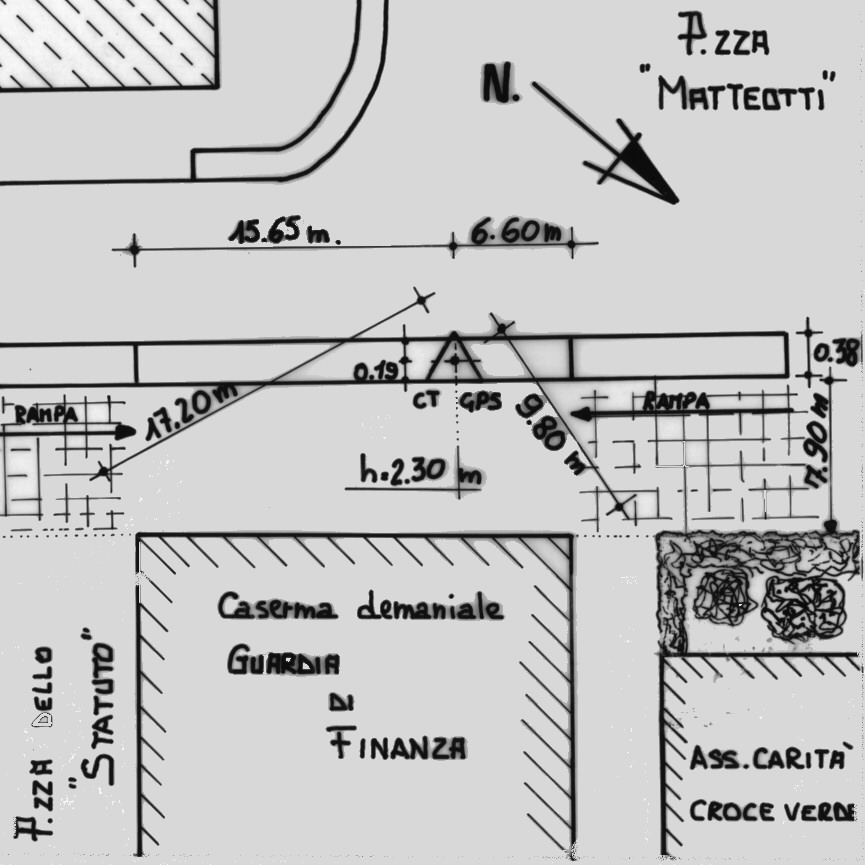 | Materializzazione | Centrino del tipo "GPS C" fissato sul muro di sostegno della rampa d'accesso della caserma della Guardia di Finanza di Pietrasanta in Piazza Matteotti. |