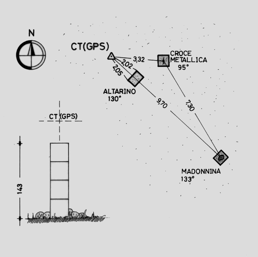 | Materializzazione | Centrino del tipo "GPS A" fissato su preesistente pilastrino metallico a sezione triangolare con sottostante centrino di fondo coassiale. Riferimenti: R1, Madonnina di metallo; R2, altarino di pietra; R3, croce metallica. |