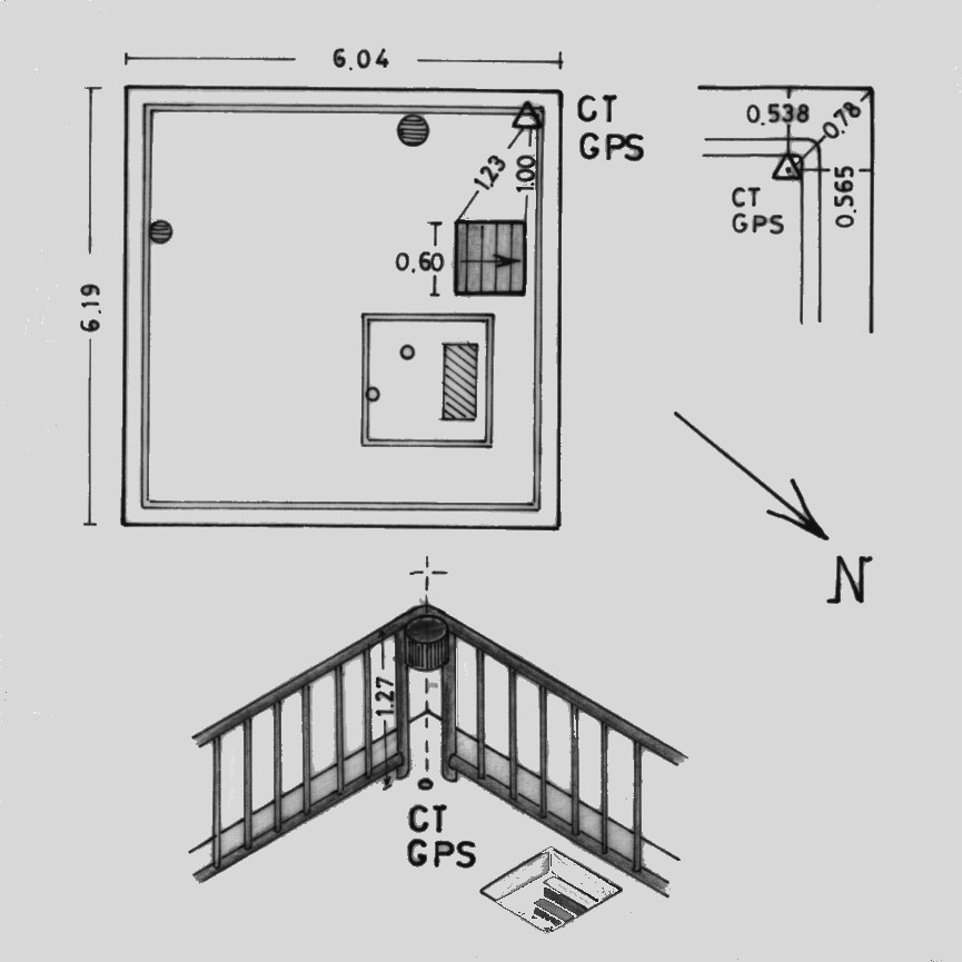 | Materializzazione | Centrino di tipo "GPS C" infisso sul pavimento a copertura della torretta, adibita ad osservatorio meteorologico e sismico, in prossimità dello spigolo ovest. E' stato saldato un tubo in ferro nell'angolo della ringhiera, in asse al centrino GPS. |