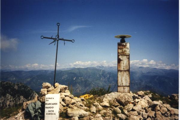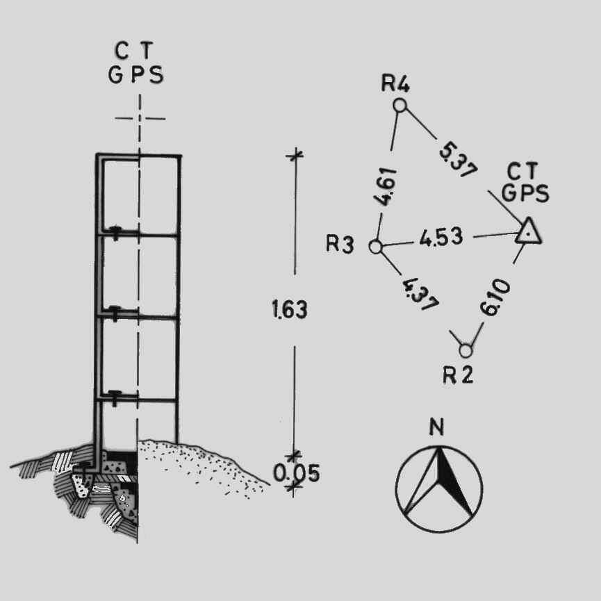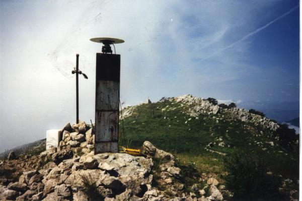 Centrino del tipo "GPS A" fissato alla sommità ed in corrispondenza dell'asse geometrico del pilastrino metallico a sezione triangolare esistente sulla cima del monte omonimo.