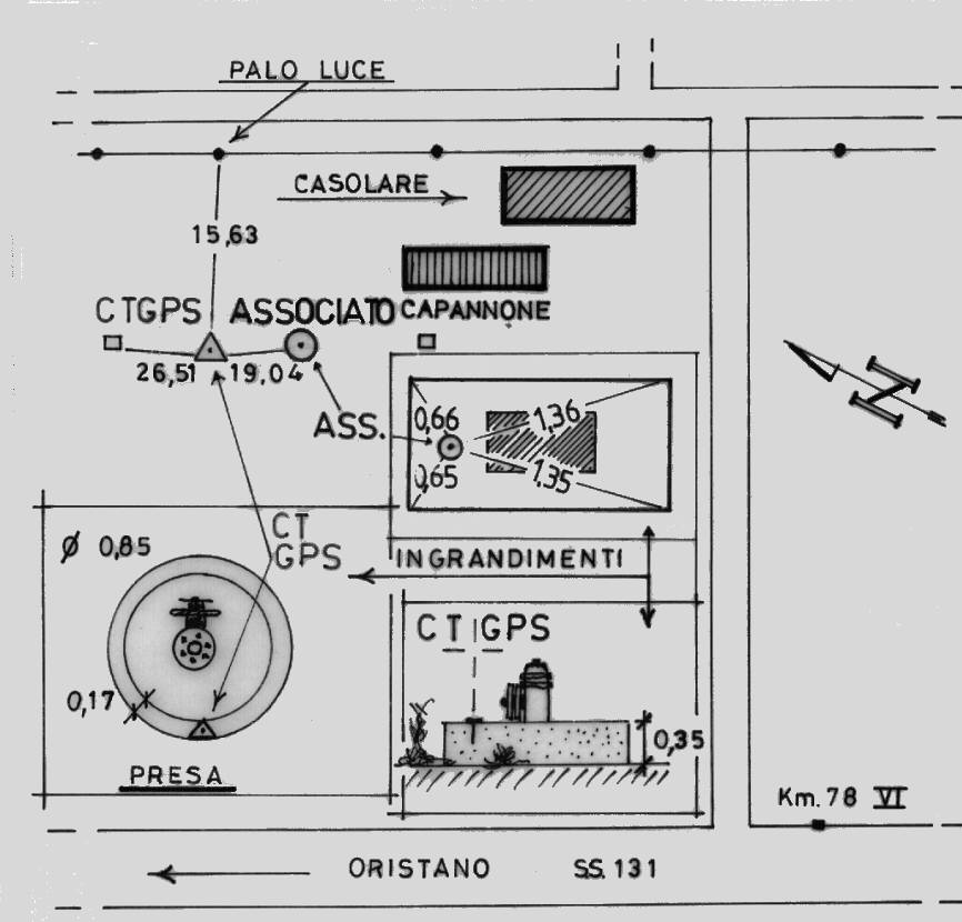 | materializzazione | Centrino del tipo "GPS C" fissato su anello di protezione in cemento della presa per irrigazione sita nelle vicinanze del podere Is Bangius. |