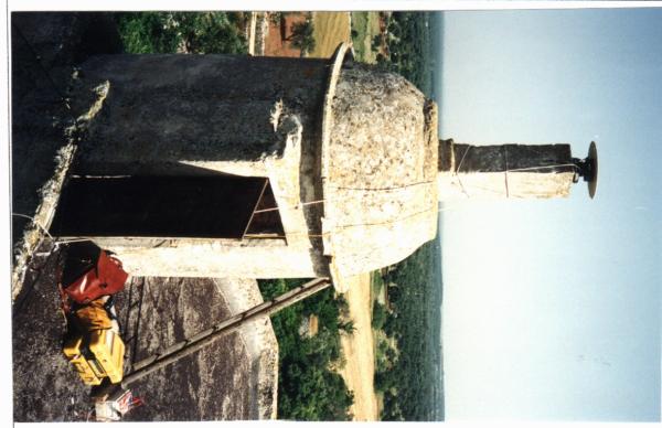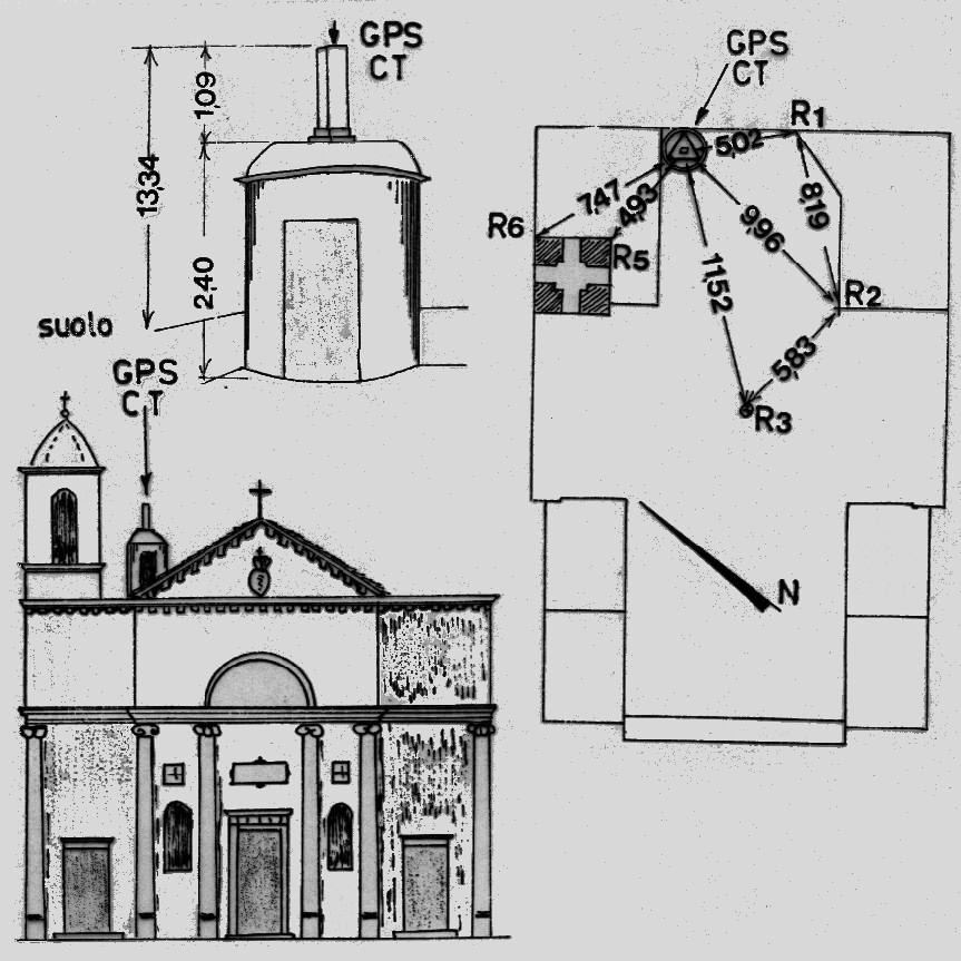 | materializzazione | Centrino di tipo "GPS A" fissato sul centrino di superficie in asse al pilastrino posto sul copriscala di accesso alla terrazza. Riferimenti: R1, R2, R3 centrini metallici; R4 scomparso; R5, R6 spigoli campanile. |
