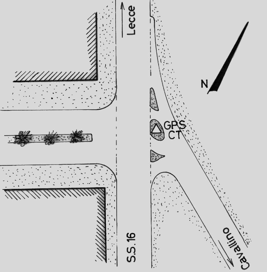| materializzazione | Centrino del tipo "GPS C" infisso nella soletta in cemento della fognatura nell'aiuola centrale esistente all'incrocio fra la S.S.16 e la strada per Cavallino. |