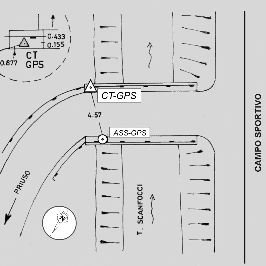 Centrino di tipo "GPS C" infisso sul cordolo in cemento armato sinistro, venendo da Priuso, del ponte sul Torrente Scanfocci, di fronte al campo sportivo.