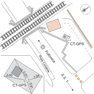 | materializzazione | Centrino universale GPS in acciaio Inox infisso sulla sommità della cabina in cemento armato posta sul terrapieno a destra del sottopassaggio che conduce alla stazione ferroviaria, in adiacenza alla stradina sterrata che conduce all'ex cantoniera ferroviaria. |
