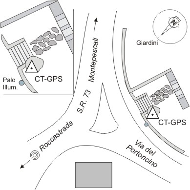 | materializzazione | Centrino universale GPS in acciaio Inox infisso sulla sommità della roccia affiorante a destra delle scalette d'accesso all'Arco del Portoncino. |