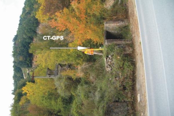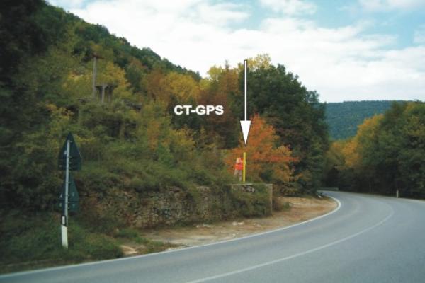 | materializzazione | Centrino universale GPS in acciaio Inox infisso sulla sommità del primo manufatto in cemento, facente parte dei ruderi della teleferica di una vecchia cava, a monte della strada. |