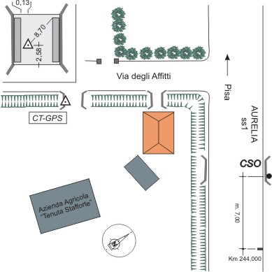 | materializzazione | Centrino universale GPS in acciaio Inox infisso nel basamento in cemento della strada, in prossimità della testata Sud del ponticello d'accesso da Via Degli Affitti alla Tenuta Stafforte. |