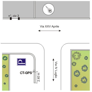 | Materializzazione | Centrino universale GPS in acciaio inox infisso su un muretto in cemento limitante un parcheggio. |