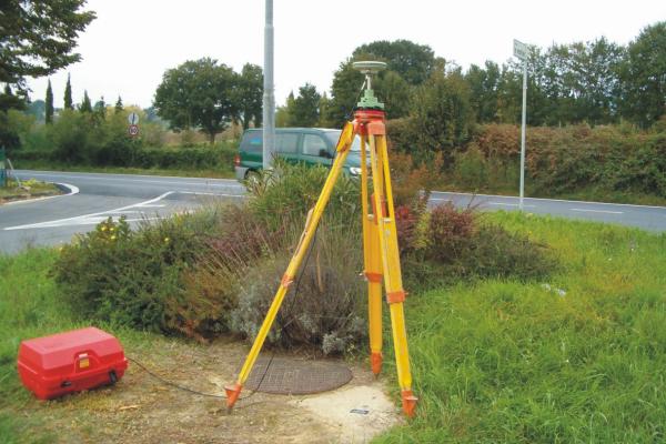 Centrino in acciaio inox del tipo GPS da livellazione infisso sul basamento in cemento di un tombino posto all'interno dell'aiuola spartitraffico centrale.