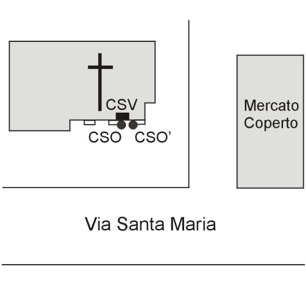 | Contrassegni | [{"simbolo_contrassegno":"P1","materializzazione":"(CSO) Pozzetto in ghisa I cat. di sinistra posto alla base dello spigolo destro della chiesa\n(B =rialzato con chiusino , vedi CSO')\n(A = non misurabile)"},{"simbolo_contrassegno":"P3","materializzazione":"(CSO') Pozzeto in ghisa di destra posto allo spigolo destro della chiesa (contrassegno \"B\" della 1\u00b0 cat.).\n( A= non misurato)"},{"simbolo_contrassegno":"V1","materializzazione":"(CSV) Mensola in ghisa posta in corrispondenza del CSO"}] |