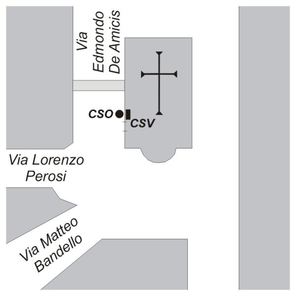 [{"simbolo_contrassegno":"B1","materializzazione":"(CSO) Bullone in ghisa infisso a sinistra della porta vicina al campanile sulla facciata destra"},{"simbolo_contrassegno":"V1","materializzazione":"(CSV) Mensola infissa sulla facciata in corrispondenza del CSO"}]