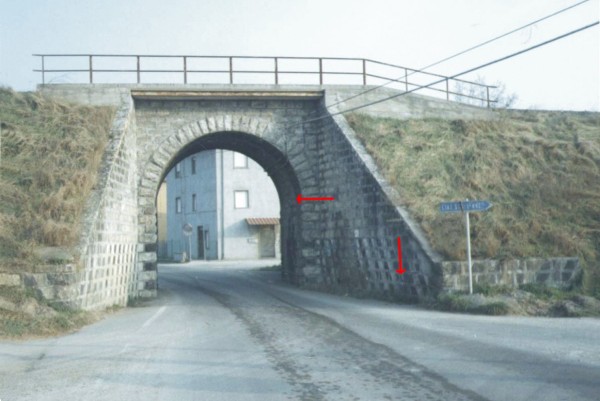 | Contrassegni | [{"simbolo_contrassegno":"B4","materializzazione":"(CSO) Bulloncino inox di tipo ABT fissato sul muretto d'ala del sottopasso F.S. in localit\u00e0 Piasciarello."},{"simbolo_contrassegno":"V5","materializzazione":"(CSV) Piastrina metallica di tipo ABT infissa sulla spalla destra del sottopasso F.S. in localit\u00e0 Pisciarello."}] |