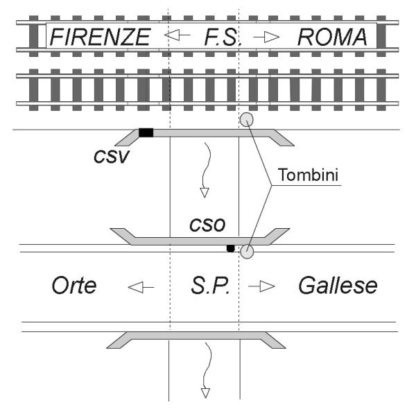 | Contrassegni | [{"simbolo_contrassegno":"B4","materializzazione":"(CSO) Bulloncino inox di tipo ABT infisso vicino al tombino ubicato sul ponte della S.P. Gallese – Orte."},{"simbolo_contrassegno":"V5","materializzazione":"(CSV) Piastrina metallica di tipo ABT infissa sul lato sinistro del ponte ferroviario. Roma – Firenze."}] |