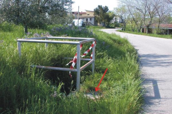 | materializzazione | Centrino metallico su piccolo tombino. |