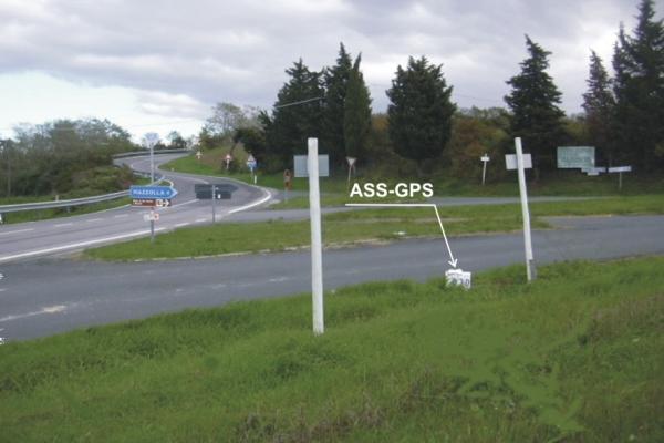 Centrino in acciaio inox del tipo "GPS C" infisso sulla sommità di un chiavicotto in cemento ubicato in corrispondenza del bivio per Mazzolla.