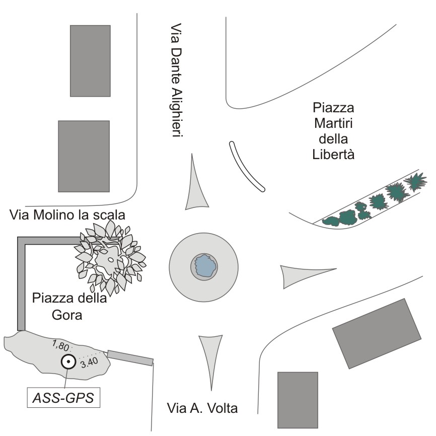 | Materializzazione | Centrino in acciaio inox del tipo "GPS C" infisso sulla roccia dell'antica gora posta in piazza della Gora. |