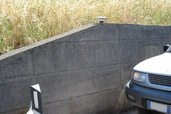 | materializzazione | Centrino inox infisso in prossimità dell'estremità nord del muro di sostegno situato al Km 167,200 della SR 2 Cassia, in prossimità del bivio per Campiglia d'Orcia |