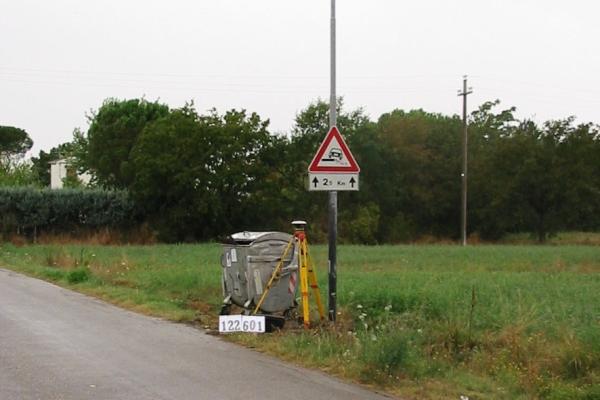 | materializzazione | Centrino inox infisso sul basamento in calcestruzzo del palo d'illuminazione adiacente al cassonetto dei rifiuti situato lungo la strada che da Ferretto conduce a Piana – Palazzetto. |