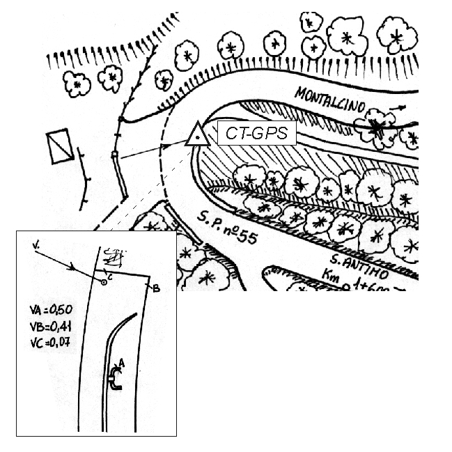 | materializzazione | Centrino inox infisso all'estremità nord dl cordolo laterale del ponte sul tornante al Km 1,550 circa della SP 55 che da Montalcino conduce a Sant'Antimo. |