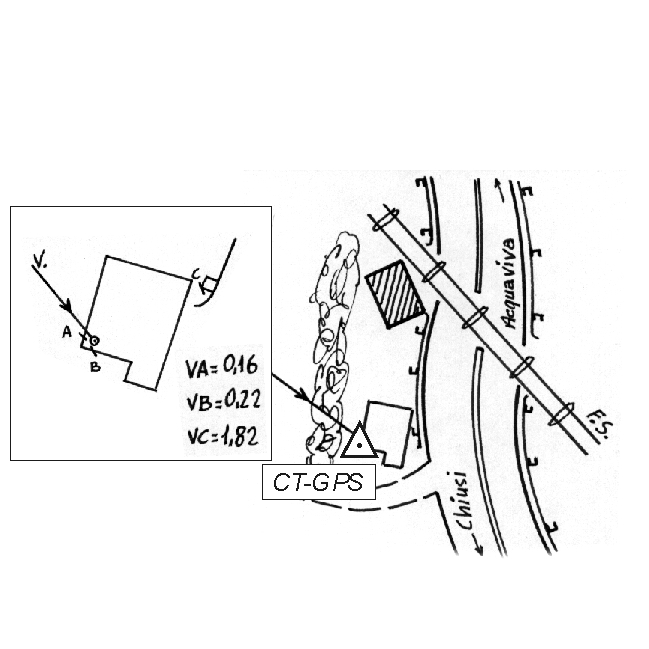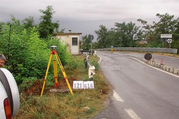 Centrino inox infisso su un vecchio basamento in cls situato al Km 44,450 della SR 326 di Rapolano, fra il passaggio a livello e il ponte sul fosso Salcheto.