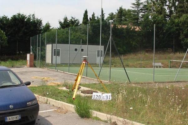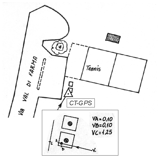 | materializzazione | Centrino inox infisso sullo spigolo SO del tombino situato fra il parcheggio di via val di Farma e i campi da tennis adiacenti. |