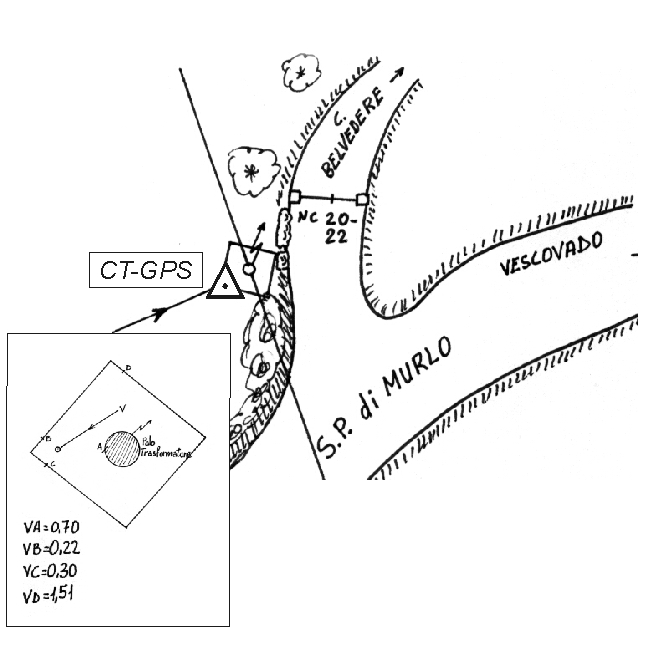 | materializzazione | Centrino inox infisso presso lo spigolo NO del basamento in cls del palo trasformatore all'altezza della casa denominata Belvedere in via Prov. Di Murlo n. 20-22, nelle vicinanze dell'accesso al Castello di Crevole. |