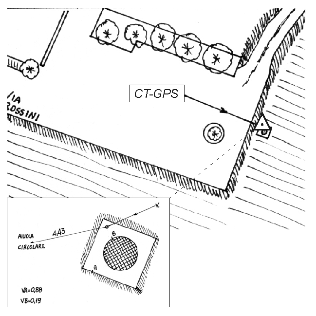 | materializzazione | Centrino inox infisso sullo spigolo del tombino ubicato a margine del piazzale situato alla fine di via Rossini, nella zona residenziale a sud di Rosia |