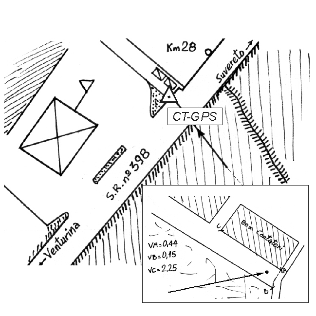 | Materializzazione | Centrino inox infisso sul basamento in cls del box contatori situato a lato dell'accesso al distributore Agip al Km 28 della SS 398 della Val di Cornia. |