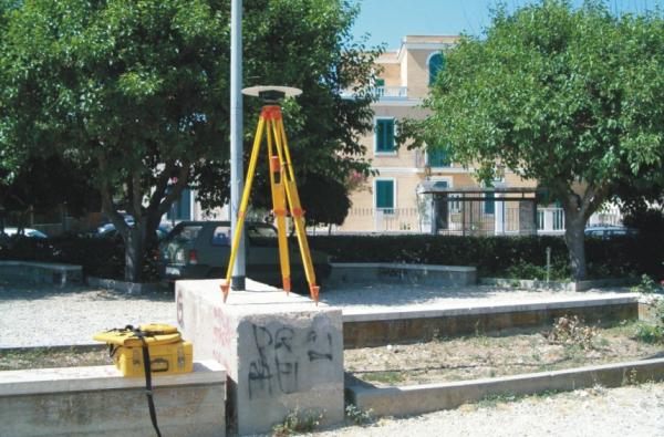 Centrino universale GPS in acciaio inox infisso sulla sommità di un basamento in cemento armato all'interno di un giardino pubblico antistate il Vialetto Rucellai, sul lato opposto della strada.