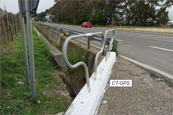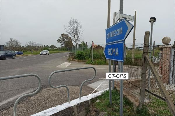 | materializzazione | Centrino universale GPS in acciaio inox infisso sulla sommità del cordolo in cemento armato delimitante a nord la svolta per Via della Stazione di Furbara. |